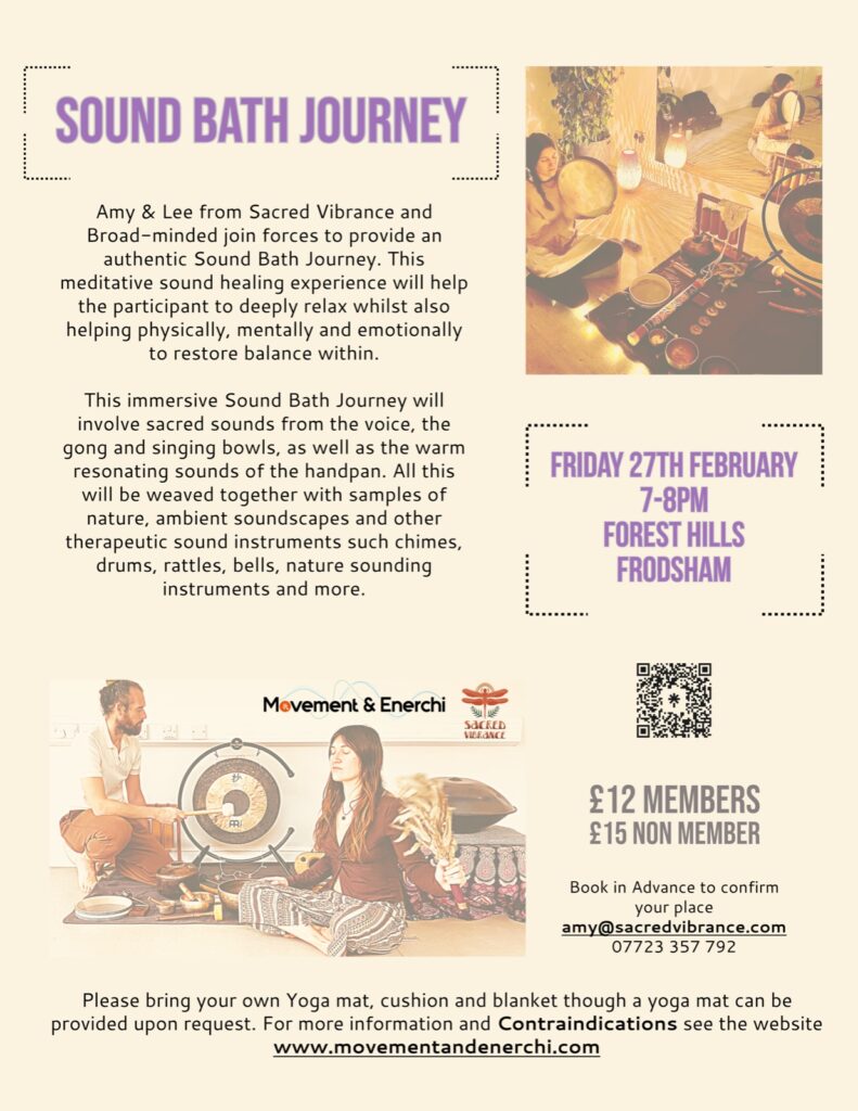 Sound Bathing with Sacred Vibrance and Broad-minded at Forest Hills Leisure Centre in Frodsham on Friday 27th February 7-8pm £12 for members and £15 for guests.